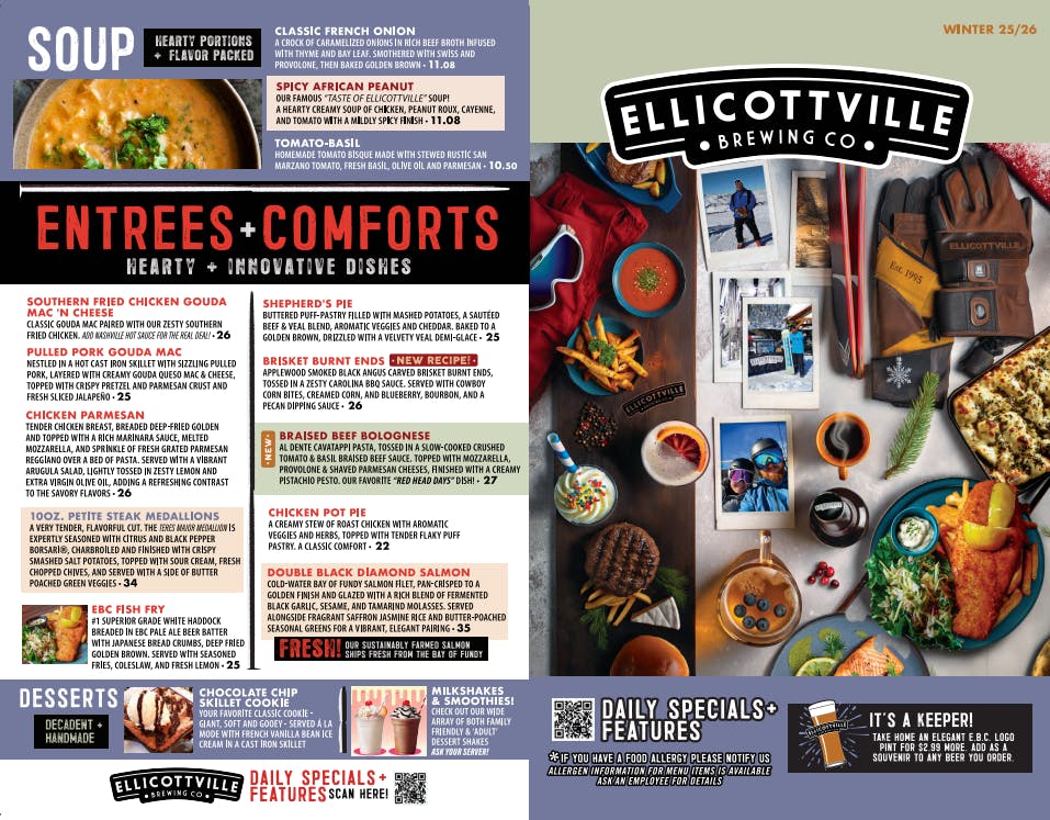 Indulge in classic Americana treats at Ellicottville Brewing Co. Now serving decadent, colorful, handmade Milkshakes, to pair with our mouthwatering array of burgers. And don't forget to try a housemade Root Beer float, made with our very own sugar cane E.B.C. Root Beer.